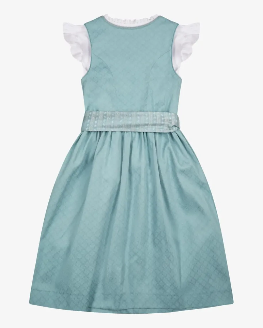 Viola Dirndl mit Bluse und Schürze für Mädchen von LODENFREY in Eisblau undWeiß. Dank der klassischen Schnittführung und dem feinen Allover-Dessin ist dasModell traditionell gehalten, während die Zierknöpfe und die changierendeSchürze optische Highlights setzen.