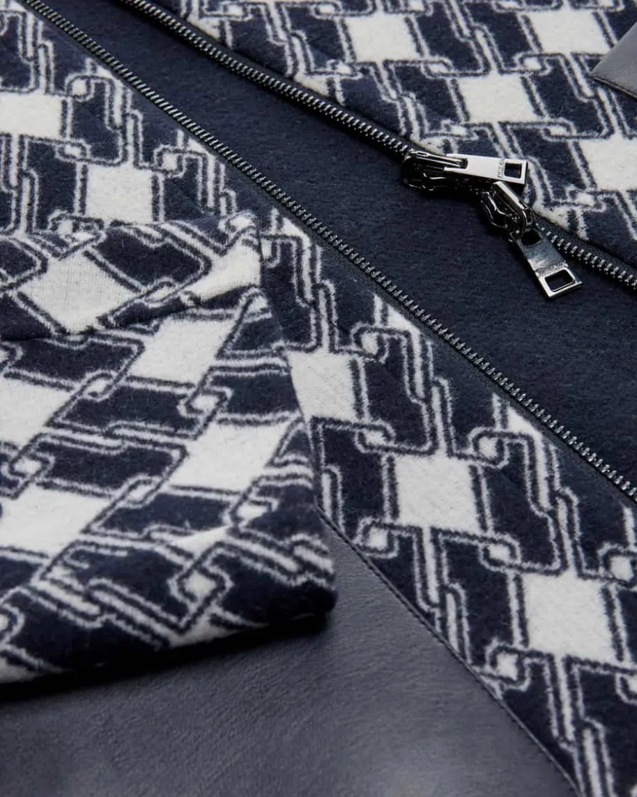 Wendejacke für Damen von Marc Cain in Navy und Off-White. Das Modell begeistertmit praktischer 2-in-1 Funktion, bei der nach Belieben gewendet werden und derGarderobe angepasst werden kann. Das grafische Muster in Kombination mit derunifarbenen Innenseite aus hochwertigem Doubleface-Woll-Mix rundet das sportiveund gleichzeitig elegante Design gekonnt ab.
