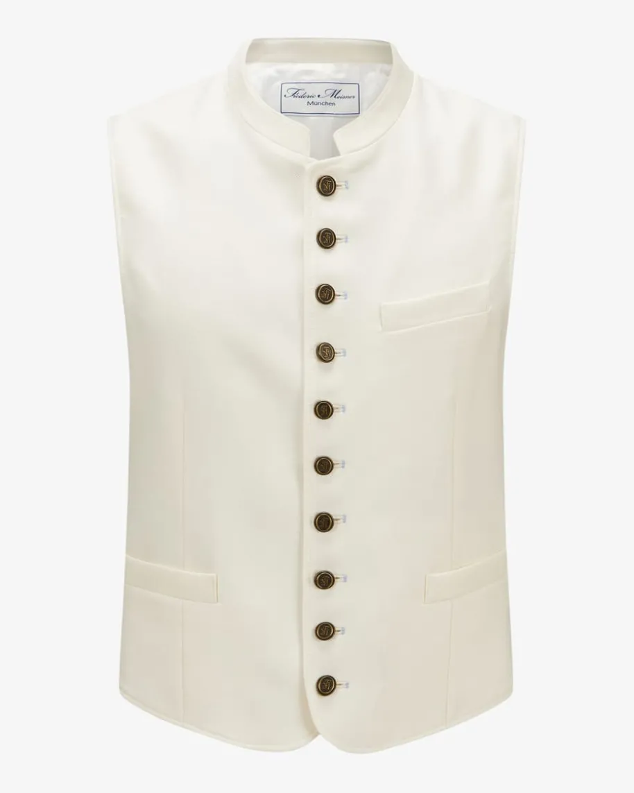 Werno Trachtenweste für Herren von Frederic Meisner in Creme. Das Modellbegeistert mit edlem Woll-Seiden-Mix, während Logo-Knöpfe den schlichtenTrachten-Look unterstreichen.