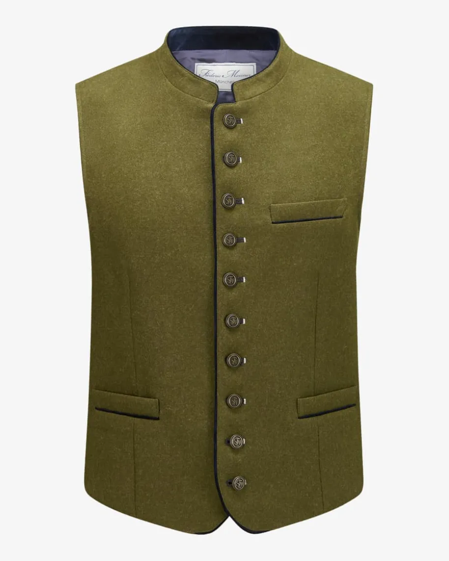 Werno Trachtenweste für Herren von Frederic Meisner in Moosgrün. Das Modellbegeistert durch die hochwertige Loden-Qualität, welche den traditionellenCharme gekonnt untermalt. Zugleich vollenden Logo-Knöpfe den schlichtenTrachten-Look harmonisch.