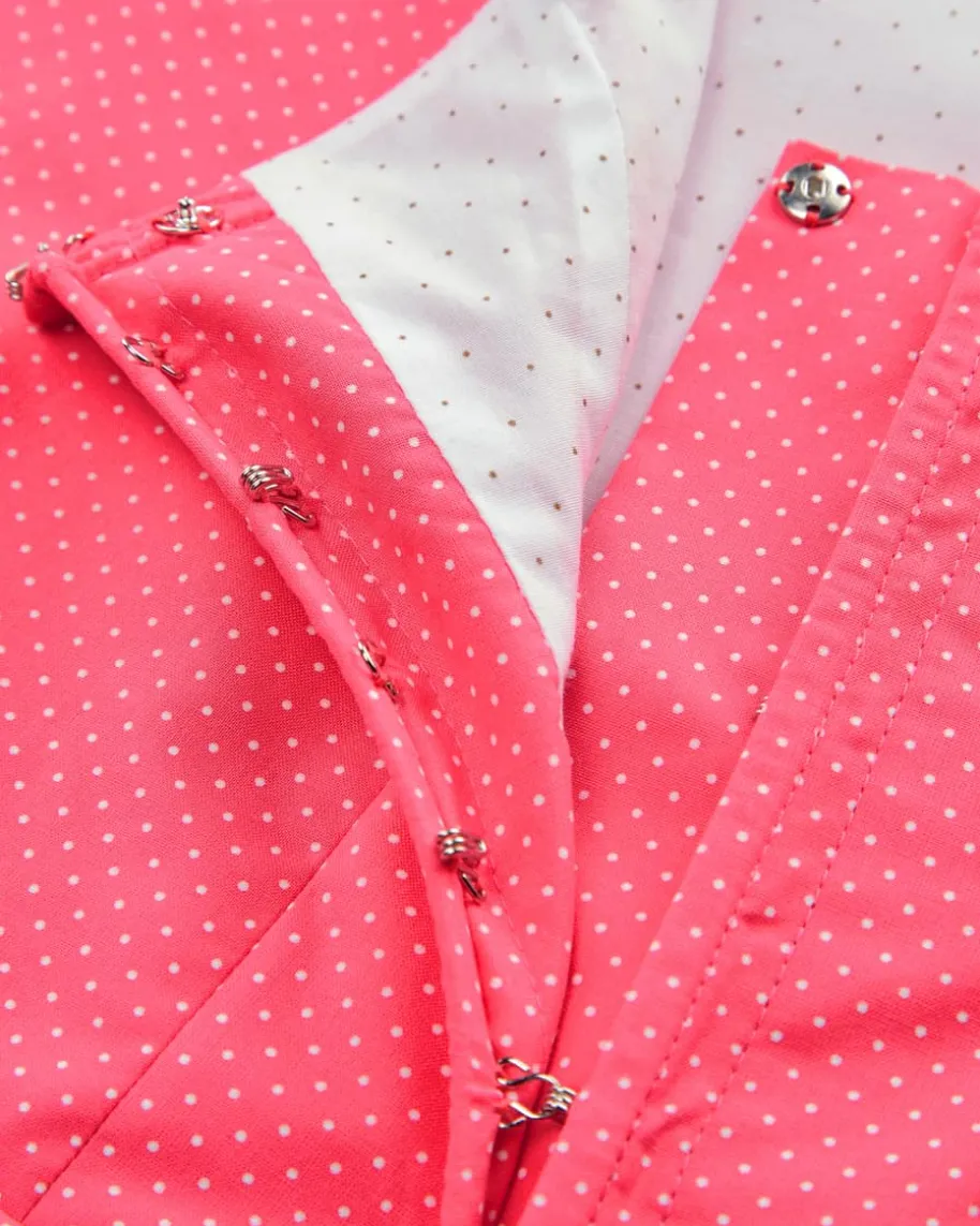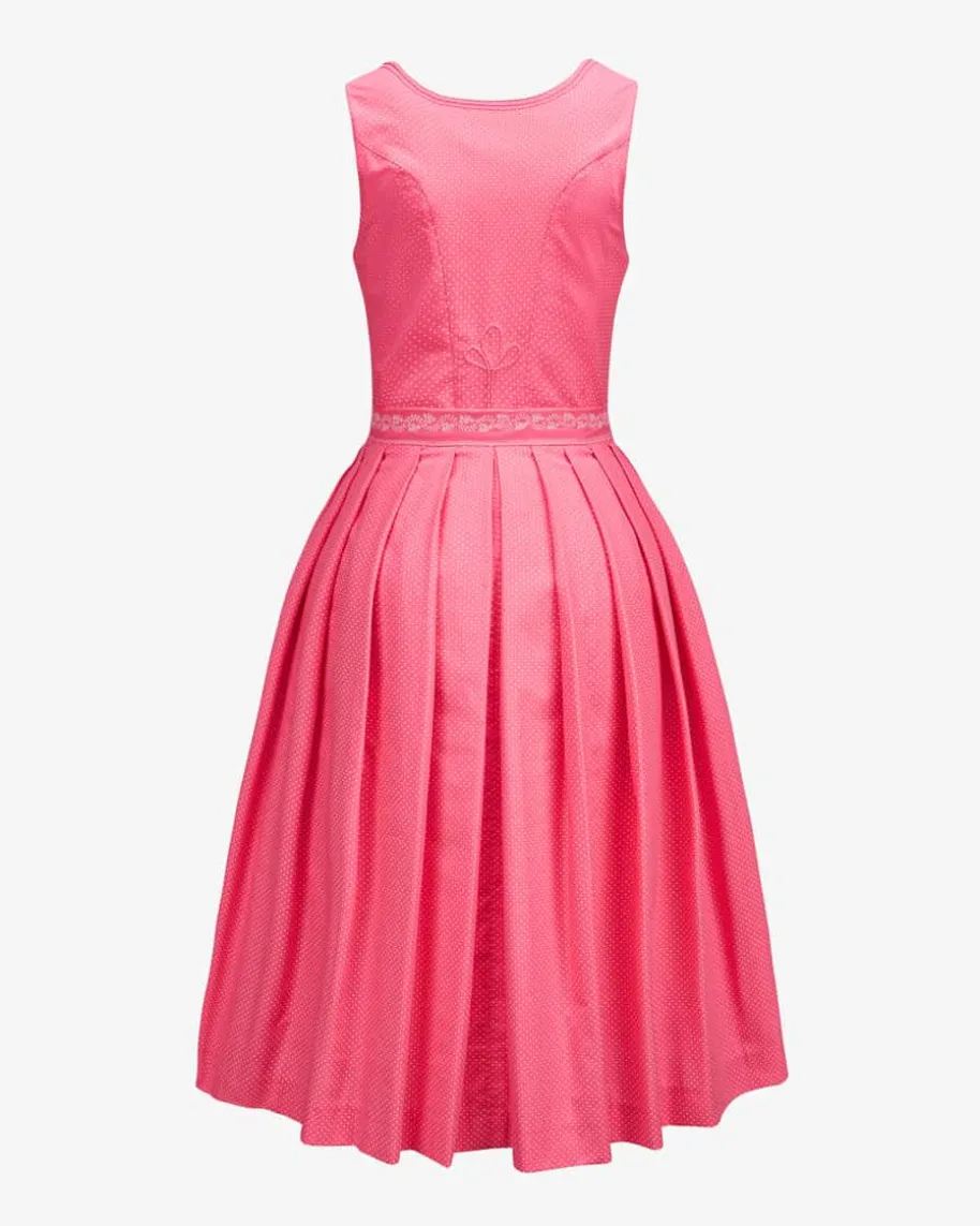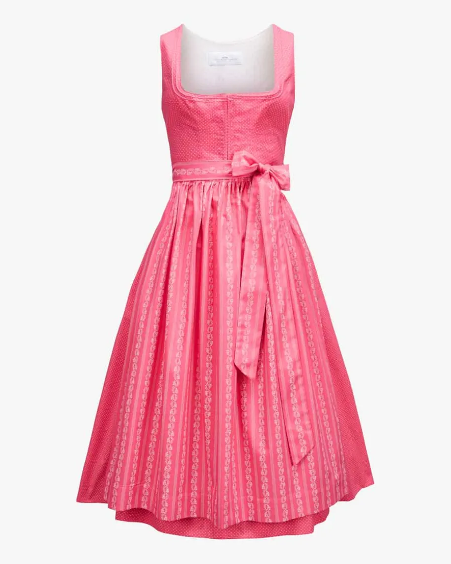 Wiesndirndl lang mit Schürze für Damen von LODENFREY in Pink und Weiß. Dank derVerwendung von leichter Baumwoll-Qualität und der Kombination von feinem Punkte-Muster und floralem Print wird ein traditioneller Favorit mit femininem Charmekreiert. Klassische Trachten-Details runden das stilvolle Gesamtbild harmonischab.