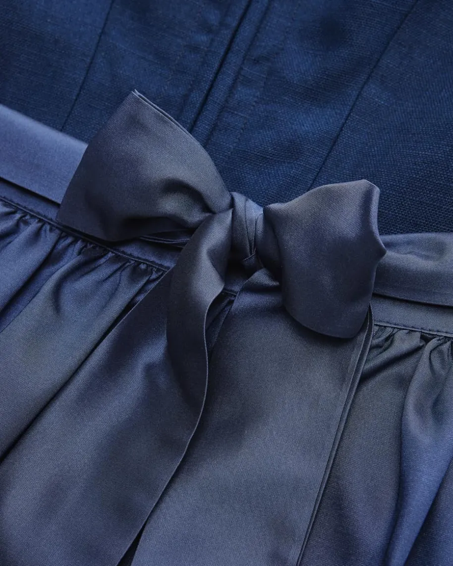Wiesndirndl lang mit Schürze für Damen von LODENFREY München 1842 in Blau undMarine. Dank der Verwendung von hochwertiger Leinen-Qualität im Mieder und einemfeinen Ornament-Muster im Baumwoll-Rock wird ein traditioneller Favorit mitminimalistischem Charme kreiert. Die changierende Schürze mit Seide rundet dasTrachten-Gesamtbild harmonisch ab.