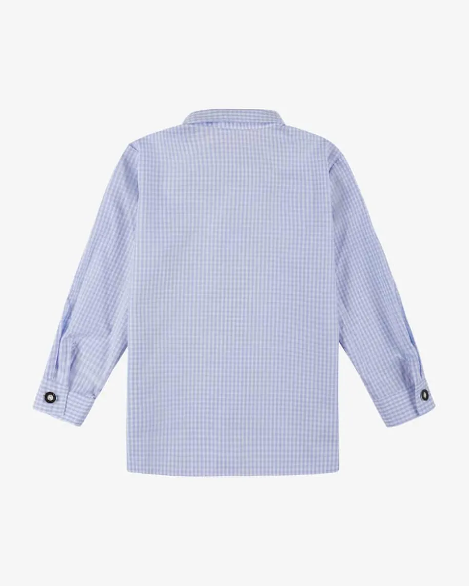 Wolfgang Baby-Trachtenhemd von Pacher in Hellblau und Weiß. Das geradegeschnittene Modell präsentiert sich dank klassischem Karo-Dessin intraditioneller Aufmachung, während die Knöpfe in Horn-Optik sowie dieBrusttasche das Gesamtbild gekonnt ergänzen.