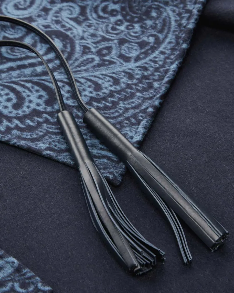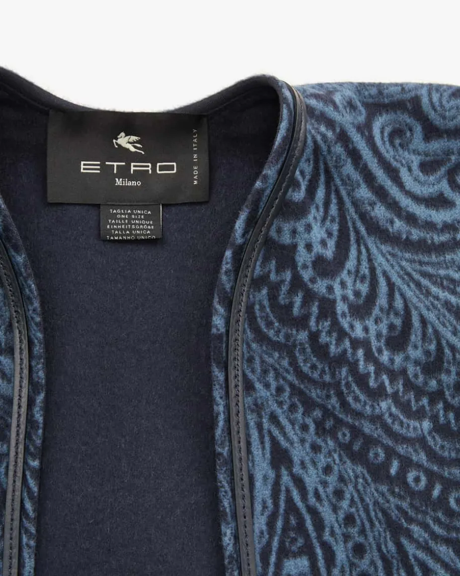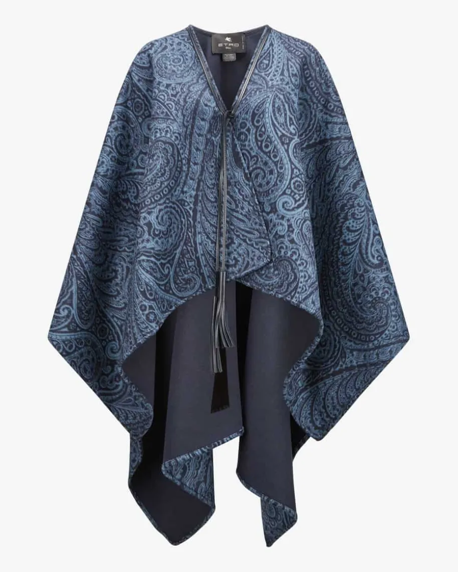 Woll-Cape für Damen von Etro in Navy und Hellblau. Das weite Modell punktet dankhochwertigem Woll-Cashmere-Mix mit einer weichen Haptik, während daslabeltypische Paisley-Dessin den Look stilvoll in Szene setzt. Für ein optischesHighlight sorgt zudem das tonale Lederband mit Quasten-Detail.