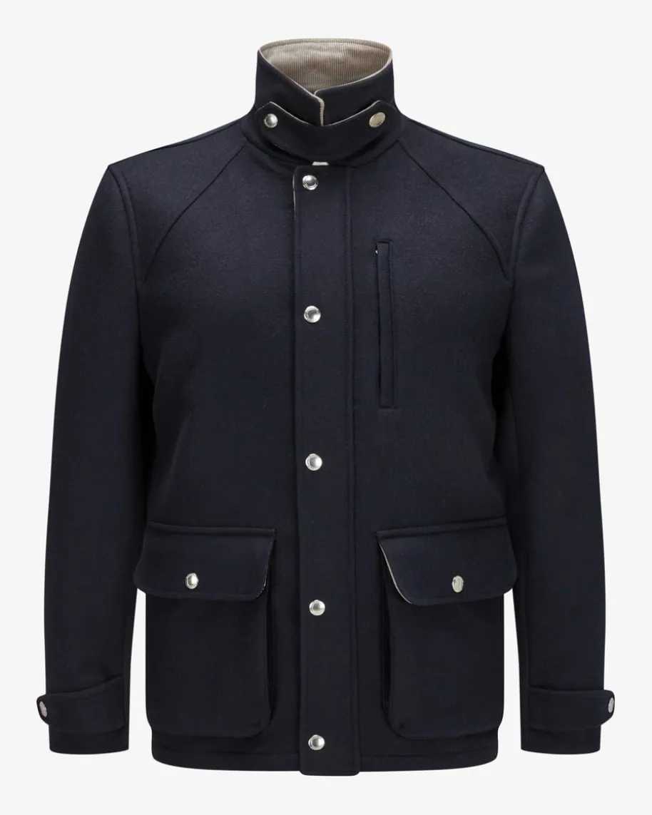 Woll-Fieldjacket für Herren von Brunello Cucinelli in Navy. Made in Italy – Daselegante Modell präsentiert sich in zeitloser Aufmachung, während diehochwertige Woll-Verarbeitung nicht nur für eine besonders angenehme Haptik,sondern auch für eine edle Optik sorgt. Klassische Details runden das maskulineDesign in Fieldjacket-Aufmachung perfekt ab.