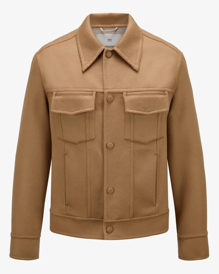 Woll-Shirtjacket für Herren von Ami Paris in Camel. Das Modell besticht dankweichem Woll-Seiden-Mix mit angenehmem Griff, während die Doubleface-Aufmachungsowie die maskuline Truckerjacket-Silhouette den Style modisch in Szene setzen.