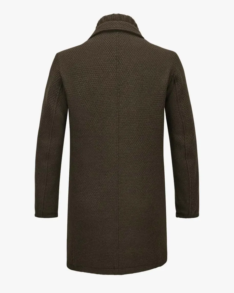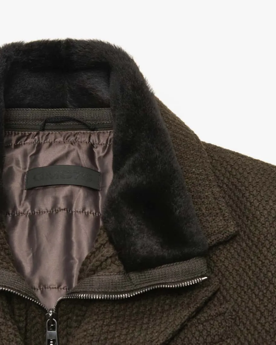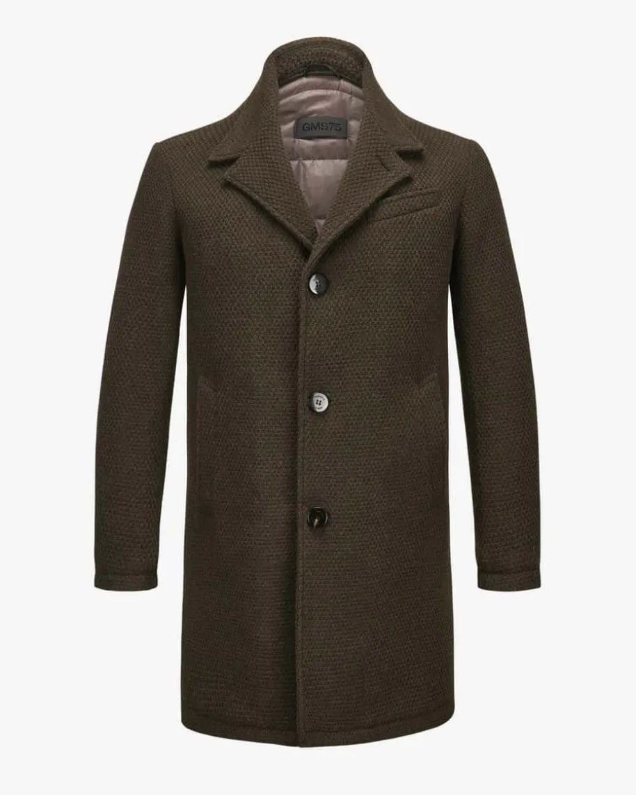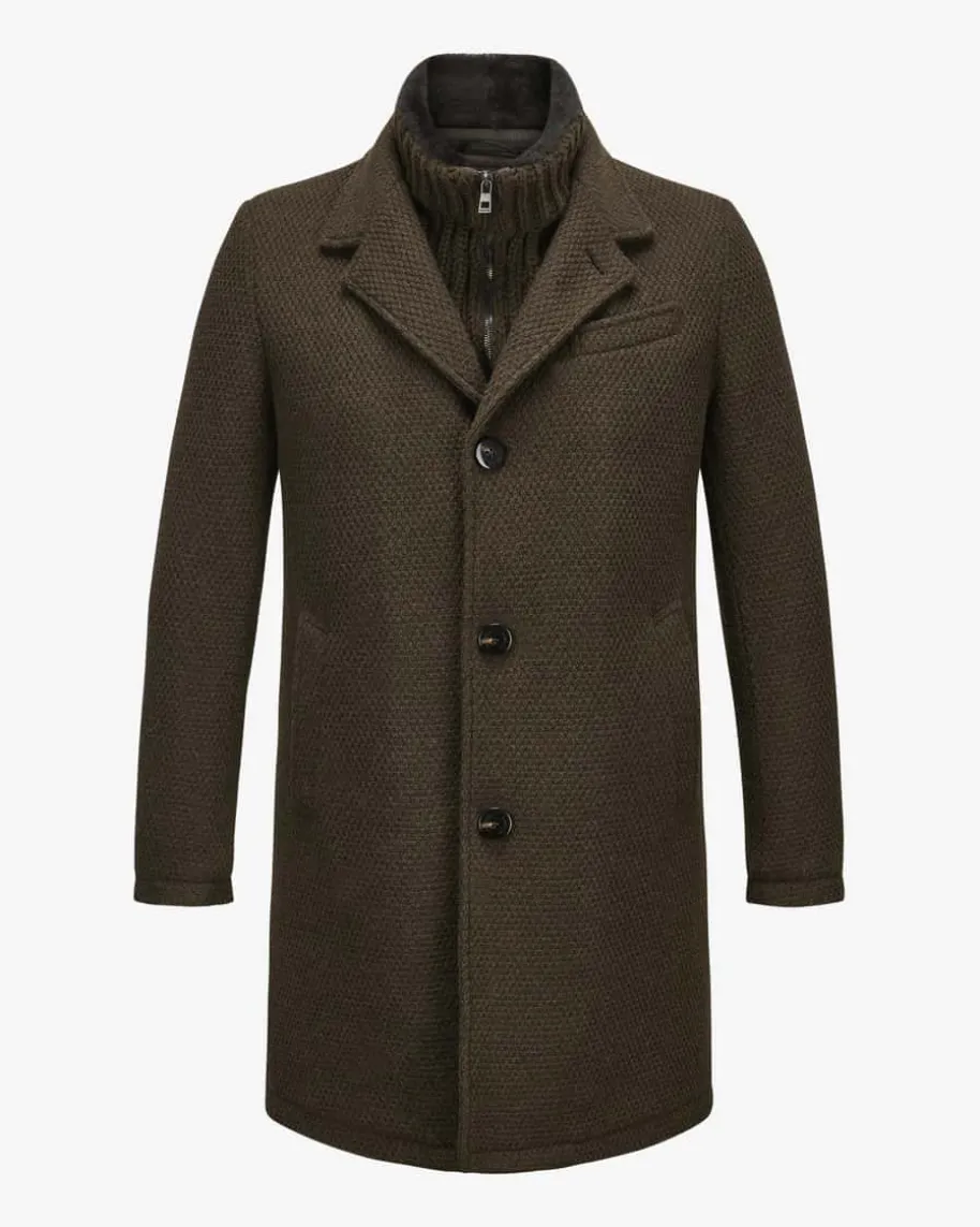 Wollmantel für Herren von GMS 75 in Oliv. Das antaillierte Modell begeistertdank des strukturierten Woll-Mix als optisches Highlight. Zugleich überzeugt dasDesign mit abnehmbarer Strickblende und weichem Schaffellkragen, während diegesteppte Innenseite für eine optimale Wärmeisolierung sorgt – Ein stilsichererFavorit für kühlere Tage.