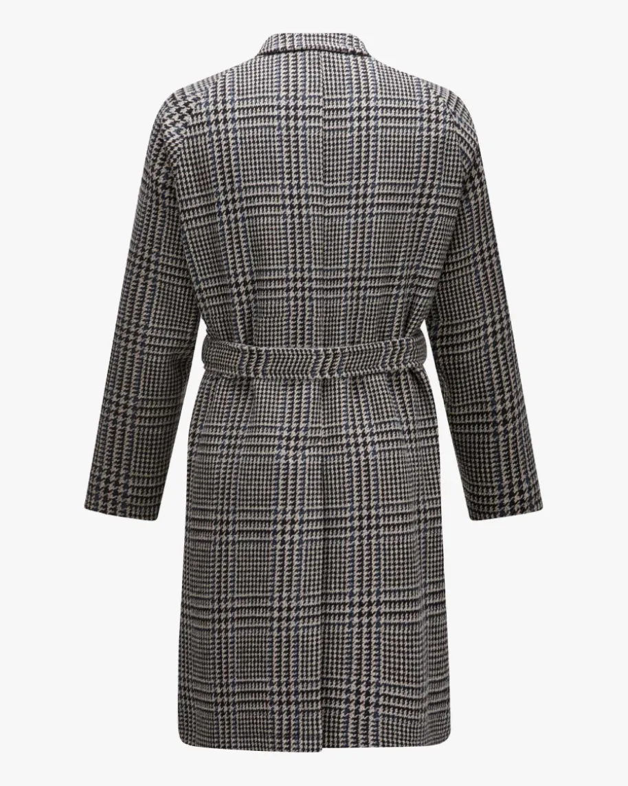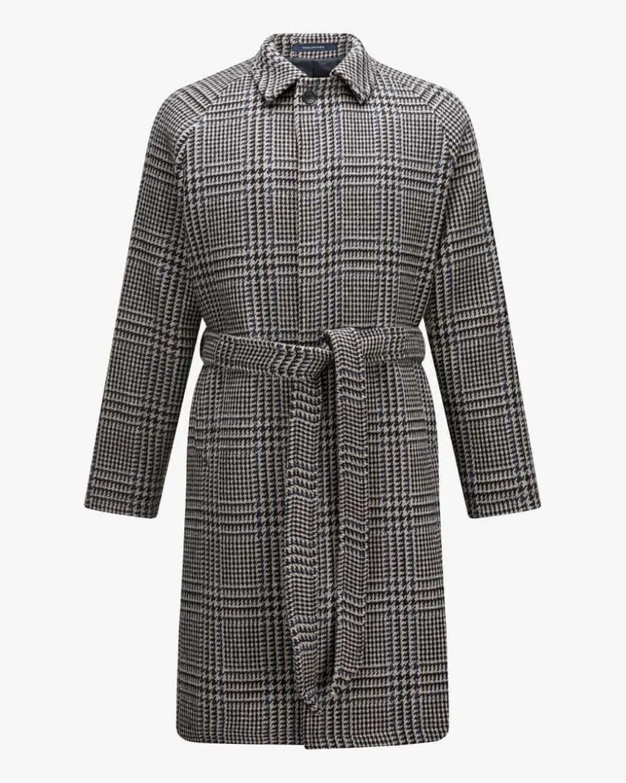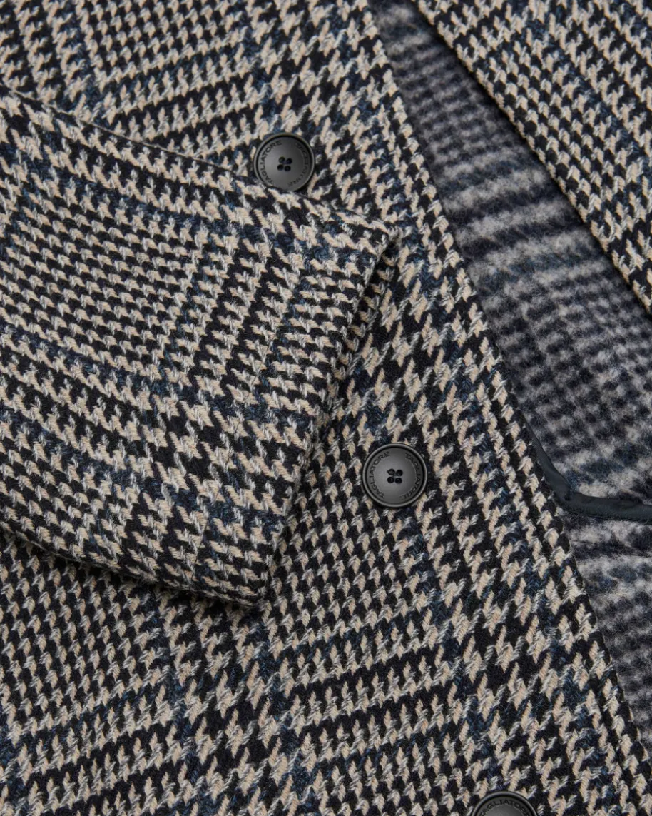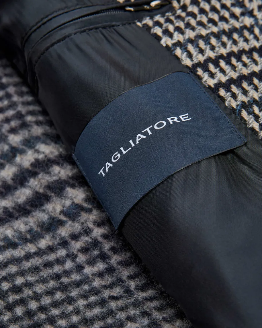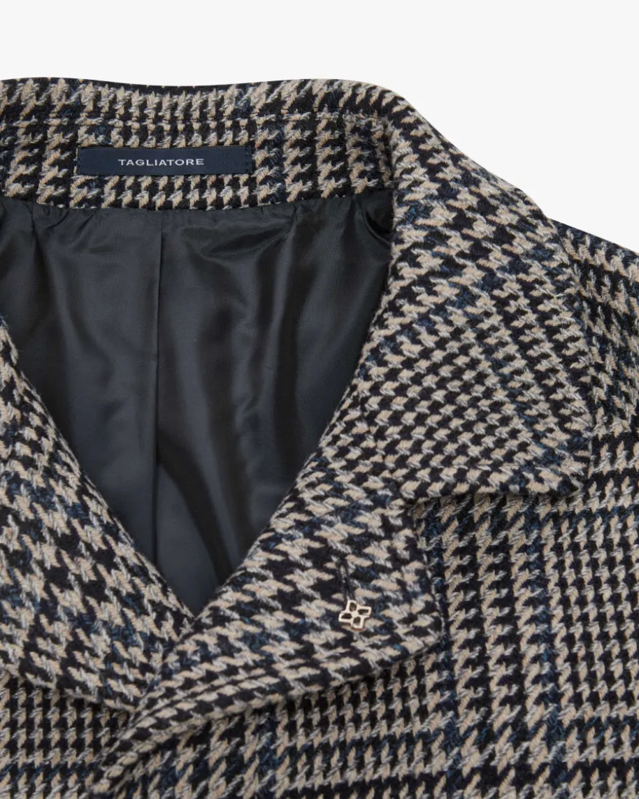 Wollmantel für Herren von Tagliatore in Blau, Marine und Sand. Gefertigt aushochwertigem Woll-Cashmere-Mix besticht das Modell mit einer angenehmen Haptik,während klassisch-elegante Details zusammen mit dem modischen Hahnentritt-Mustereinen maskulinen Favoriten für stilvolle Looks schaffen.