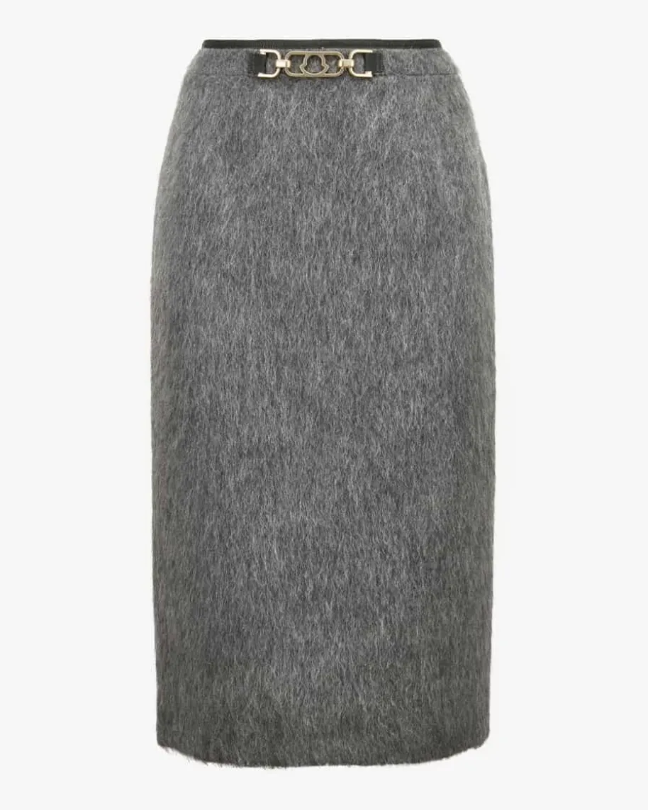 Wollrock für Damen von Moncler in Anthrazit. Das melierte Modell überzeugt mitweichem Mohair-Woll-Mix, der für angenehme Tragemomente sorgt. Die schmalePassform mit dem dekorativen Schmuck-Detail an der Taille rundet den Stylemodisch ab.