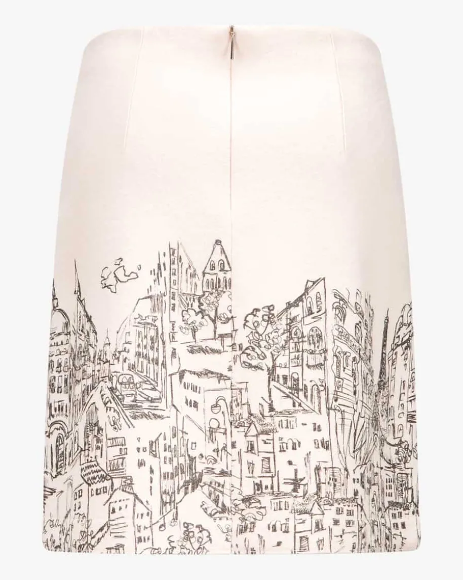 Wollrock für Damen von Marc Cain in Ecru. Marc Cain ist eine deutsche Premium-Modemarke, die seit über 50 Jahren moderne, selbstbewusste Frauen mithochwertigen Materialien und außergewöhnlichen Prints begeistert. Auch diesesModell überzeugt mit optischen wie haptischen Highlights dank der hochwertigenSchurwoll-Qualität und dem originellen Skyline-Print im Zeichenstil.