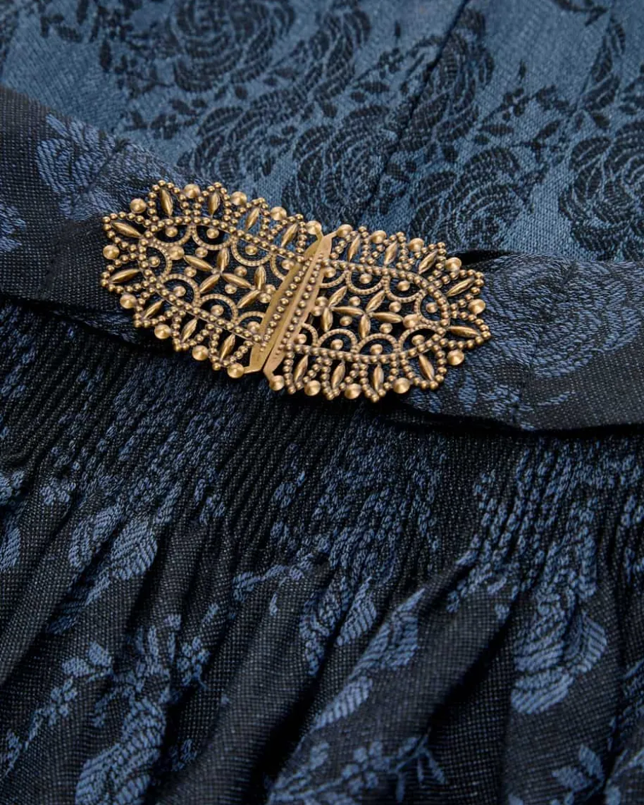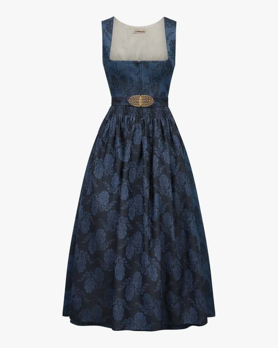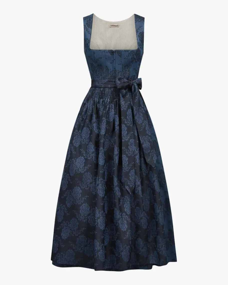 Antonia Dirndl lang mit Schürze für Damen von Gottseidank in Dunkelblau undSchwarz. Tracht mit modernem Zeitgeist – Dank des floralen Jacquard-Musters inhochwertiger Leinen-Schurwoll-Qualität begeistert das Modell mit traditionellerAufmachung. Zugleich rundet die gestiftelte Schürze mit labeltypischen,austauschbaren Schürzenbändern den Look gekonnt ab.