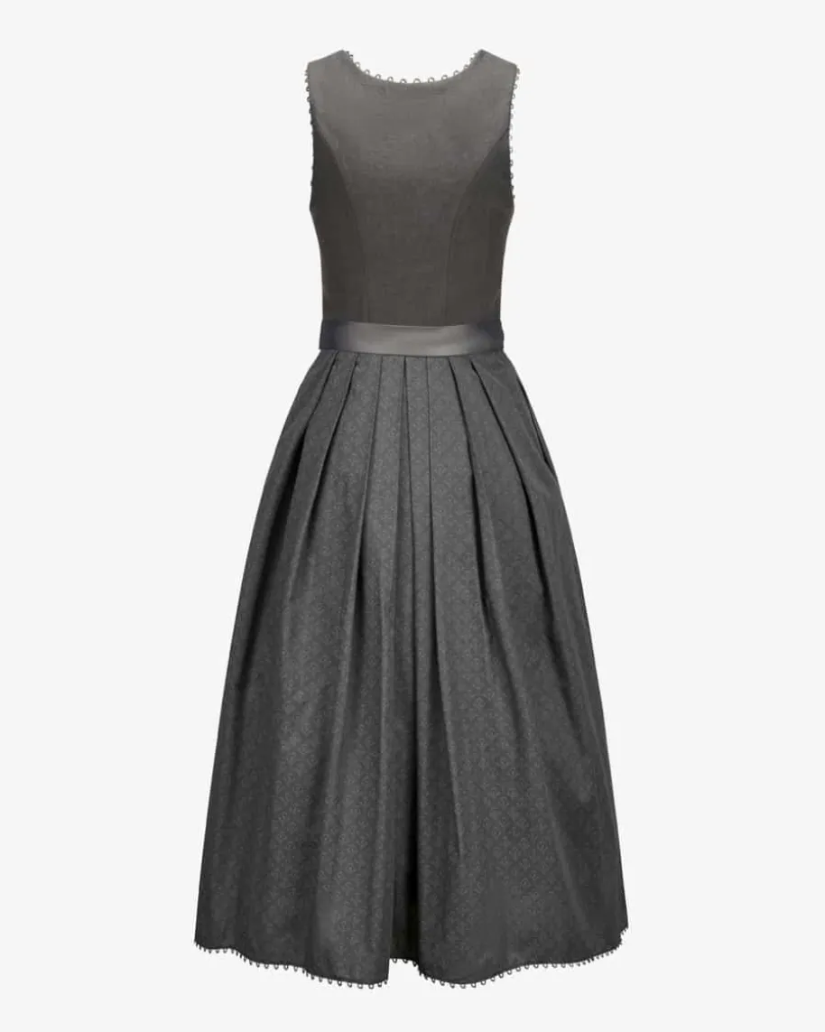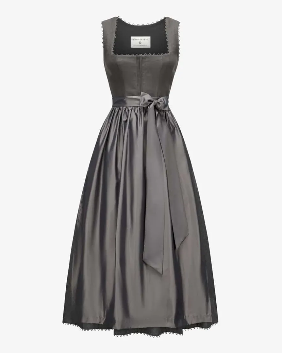 Gaby Dirndl lang mit Schürze für Damen von Kinga Mathe inAnthrazit. Mit Liebezum Detail entwirft das deutsche Label aufwendige Trachten-Kreationen mit demgewissen Etwas und überzeugt mit erlesener Stoffauswahlsowie kreative Designs.Das Modell überzeugt mit klassischem Mieder, während derUnterrock mit Volants-Saum eine feminine Passform verleiht. Die changierendeSeidenschürzekomplettiert den gepunkteten Rock harmonisch.