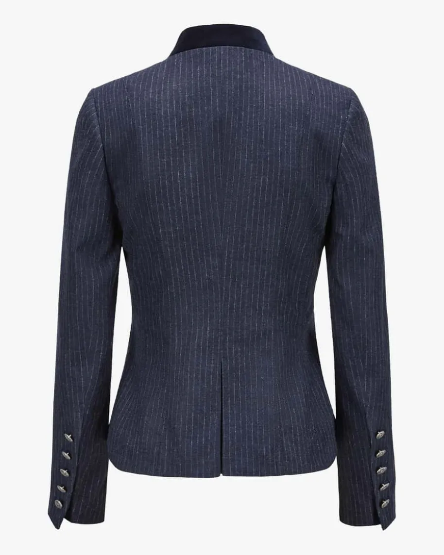 Juliette Trachtenblazer für Damen von Grasegger in Marine und Creme. Dastaillierte Modell aus der exklusiven Kollaboration mit Lodenfrey überzeugt dankhochwertiger Merinowoll-Qualität in traditioneller Aufmachung, welche durch dieraffinierten Knöpfe in geflochtener Optik sowie Samt-Details stilvoll in Szenegesetzt wird. Das Nadelstreifen-Muster verleiht zugleich eine moderne Note.