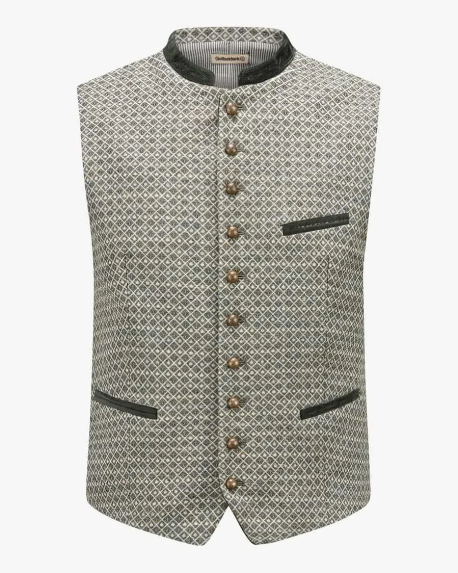 Konstantin Trachtenweste für Herren von Gottseidank in Grün, Schwarz und Creme.Das taillierte Modell überzeugt mit dem einzigartigen, exklusiv bei LODENFREYerhältlichen Karo-Muster, welches ihrem Trachten-Look eine besondere Noteverleiht. Zugleich runden raffinierte Knöpfe sowie klassische Details dastraditionelle Gesamtbild stilvoll ab.