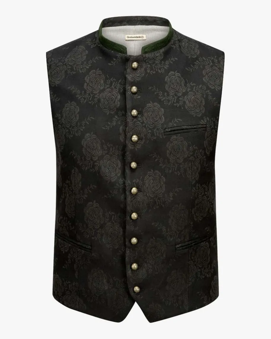Konstantin NS Trachtenweste für Herren von Gottseidank in Schwarz und Oliv. Dasexklusiv bei LODENFREY erhältliche Modell punktet dank klassischen Details intraditioneller Aufmachung, während die Front mit Rosen-Jaquard-Optik überzeugt.Für Komfort sorgt der Rücken aus elastischer Material-Qualität.