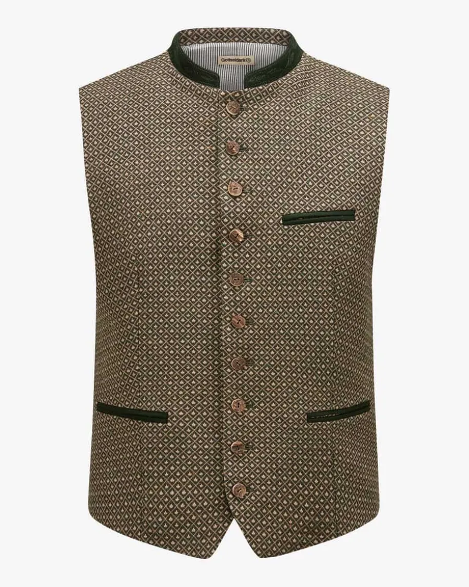 Konstantin Trachtenweste für Herren von Gottseidank in Oliv, Schwarz und Taupe.Das taillierte Modell überzeugt mit dem einzigartigen, exklusiv bei LODENFREYerhältlichen Karo-Muster, welches ihrem Trachten-Look eine besondere Noteverleiht. Zugleich runden raffinierte Knöpfe sowie klassische Details dastraditionelle Gesamtbild stilvoll ab.