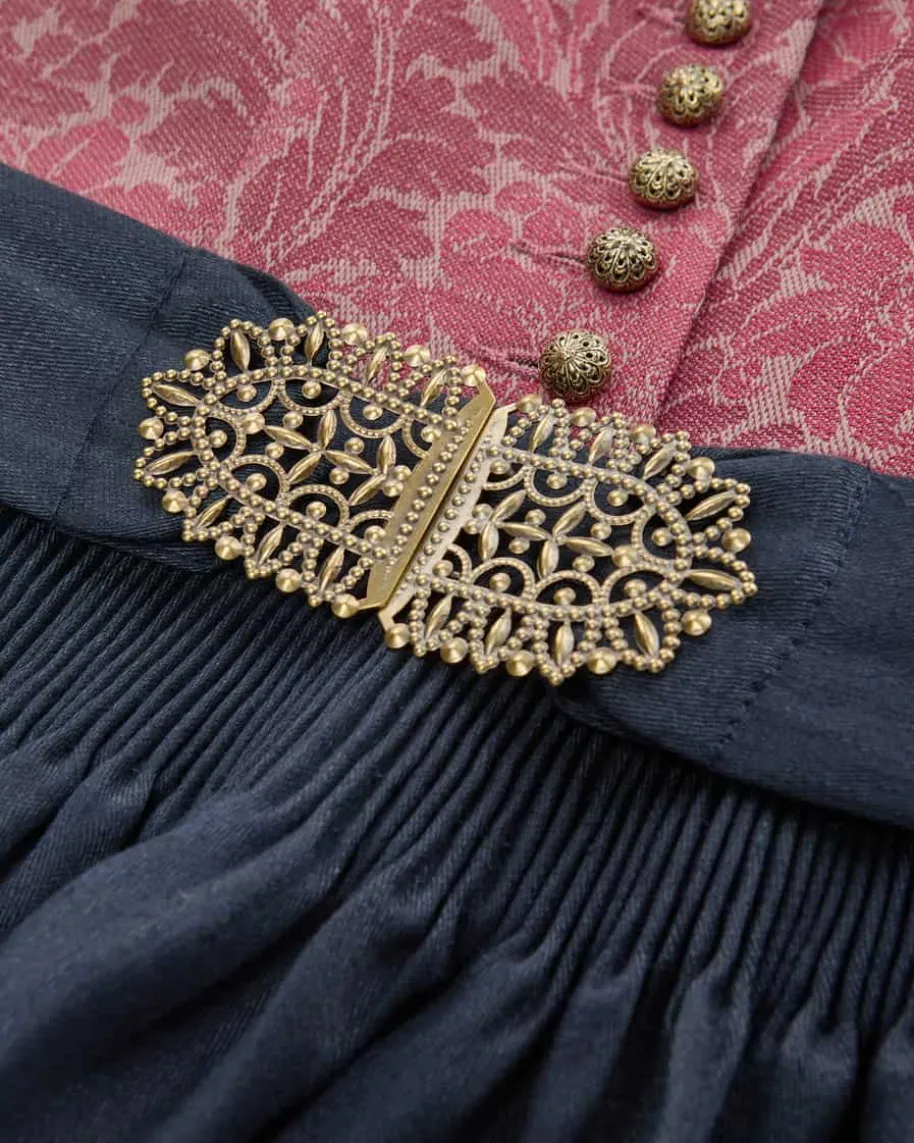 Lina Dirndl lang mit Leinenschürze für Damen von Gottseidank in Himbeere undTaupe. Tracht mit modernem Zeitgeist – Dank des floralen Allover-Mustersbegeistert das Modell in traditioneller Aufmachung mit modernem Charme, währendraffinierte Knöpfe den letzten Schliff verleihen. Zugleich rundet die schlichteSchürze das Trachten-Design mit angesagten Puff-Ärmeln gekonnt ab.