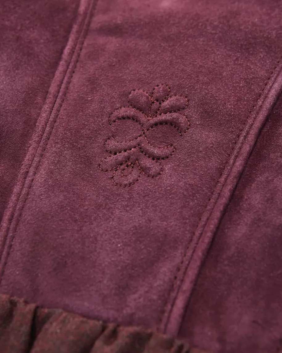 Linderhof Dirndl lang mit Schürze für Damen von Meindl in Dark Cherry. DasModell spiegelt die hochwertige Lederhandwerkskunst von Meindl gekonnt wider.Das Mieder besticht durch die Verwendung von weichem Veloursleder und wird durchfeine Zierstickereien stilvoll ergänzt. Zugleich setzt der Rock aus meliertemWoll-Mix das traditionelle Design gekonnt in Szene, während die Schürze mitfeinem Paisley-Dessin das Gesamtbild harmonisch komplettiert.
