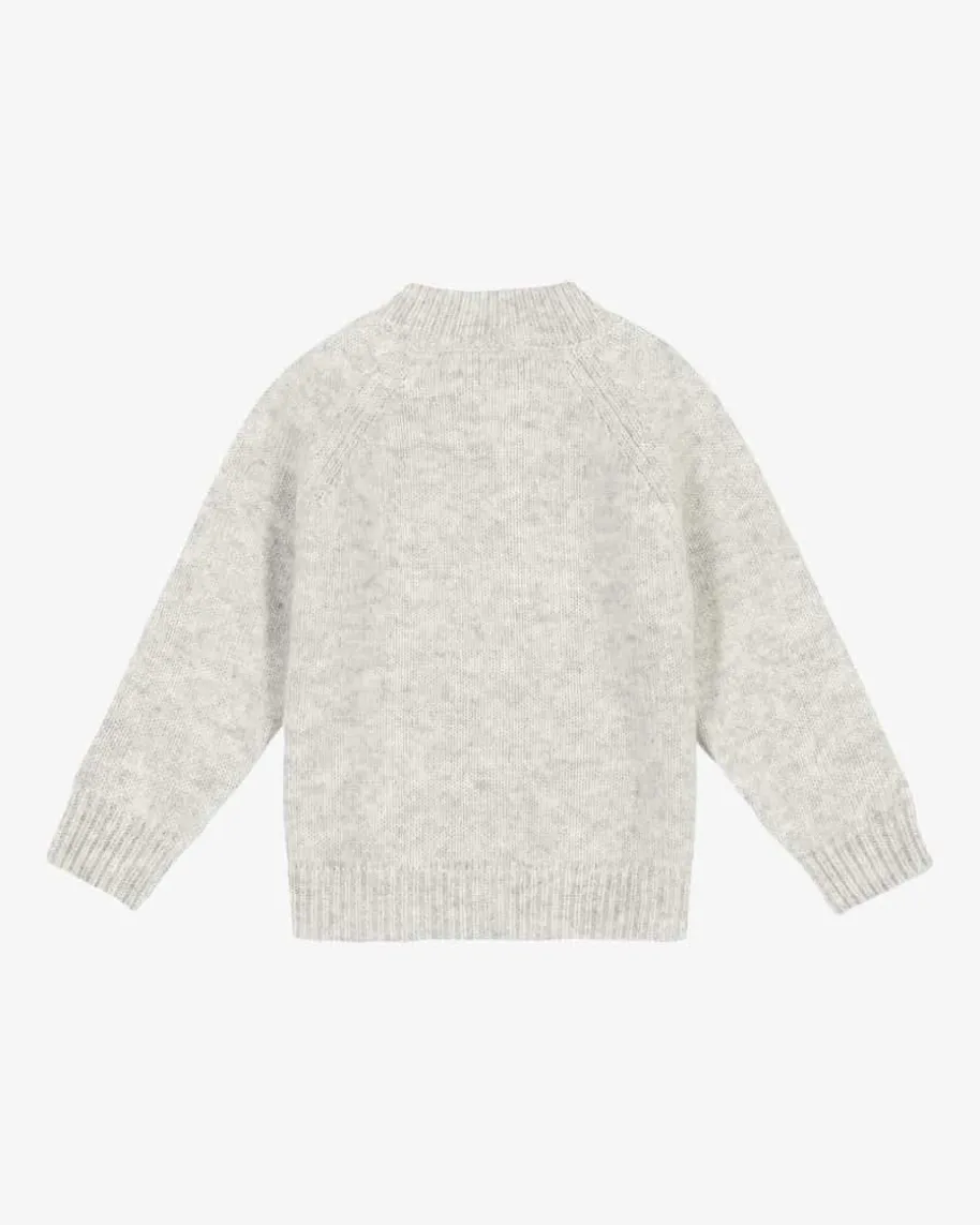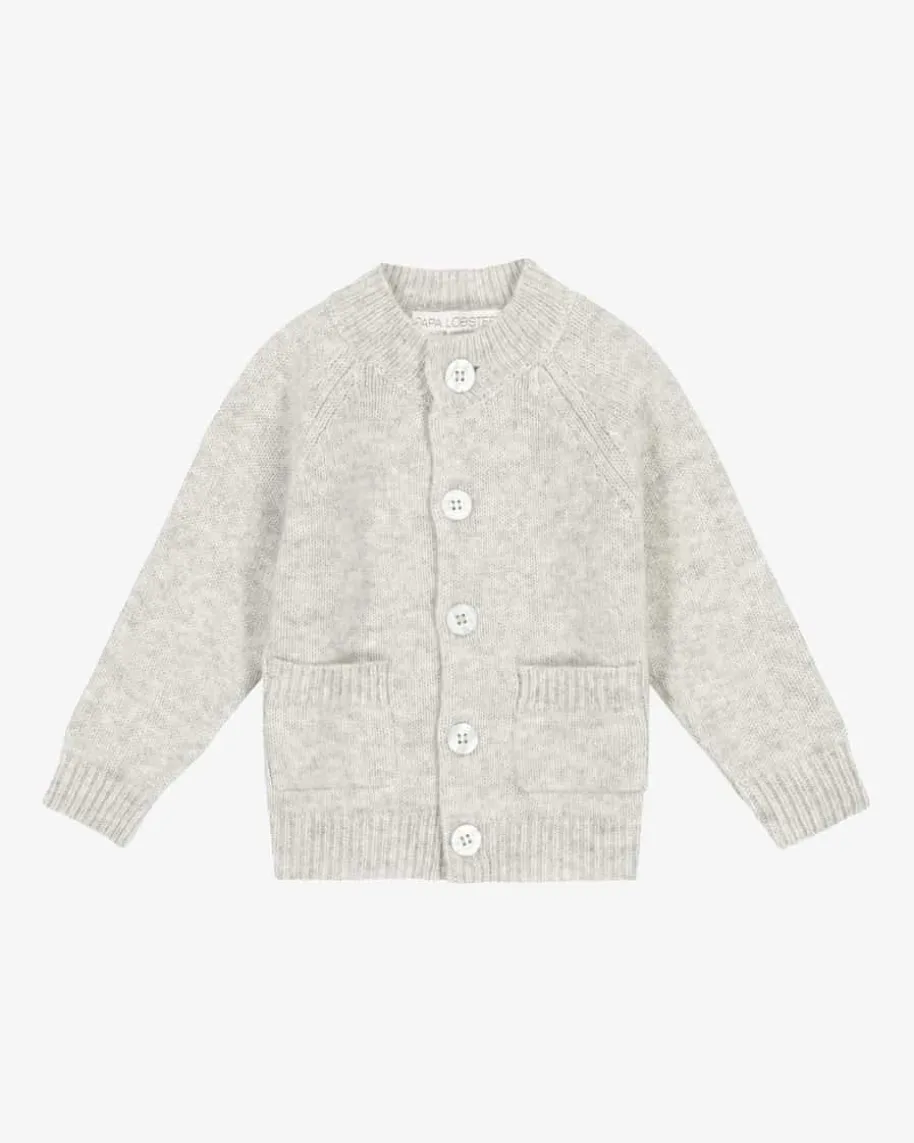 Lois Baby-Cashmere-Strickjacke von Papa Lobster in Hellgrau. Das melierte Modellbestichtdank der hochwertigen Cashmere-Qualität mit besonders angenehmen Tragemomenten,während die Stecktaschen sowie die Ziernähte den Look harmonisch abrunden.