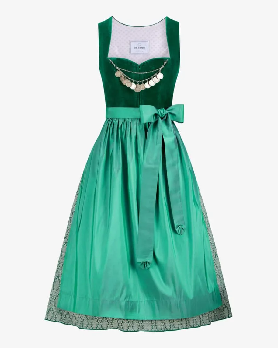 Midi-Dirndl mit Seidenschürze für Damen von Silk & Pearls x Lodenfrey in Grün.Das exklusiv bei Lodenfrey erhältliche Modell überzeugt im angesagten Ton-in-Ton-Design. Während das Samt-Mieder von einem Charivari geziert wird, untermaltder Rock mit zartem Allover-Dessin das traditionelle Gesamtbild harmonisch.Zugleich rundet die Seidenschürze den Trachten-Look stilvoll ab.