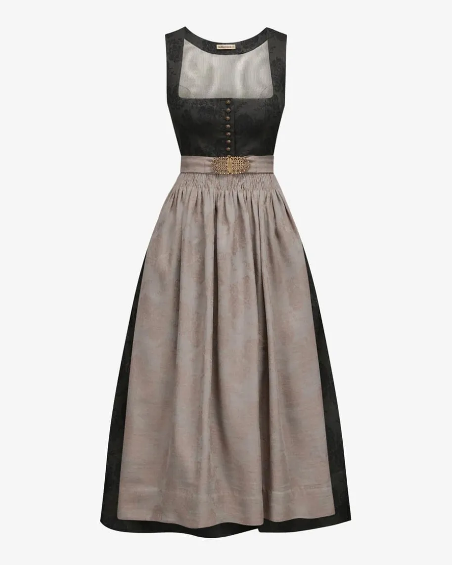 Monika Dirndl lang mit Schürze für Damen von Gottseidank in Schwarz, Taupe undHellgrau. Tracht mit modernem Zeitgeist – Dank des floralen Jacquard-Musters inhochwertiger Leinen-Schurwoll-Qualität begeistert das Modell mit traditionellerAufmachung. Zugleich rundet die gestiftelte Schürze mit labeltypischen,austauschbaren Schürzenbändern den Look gekonnt ab.