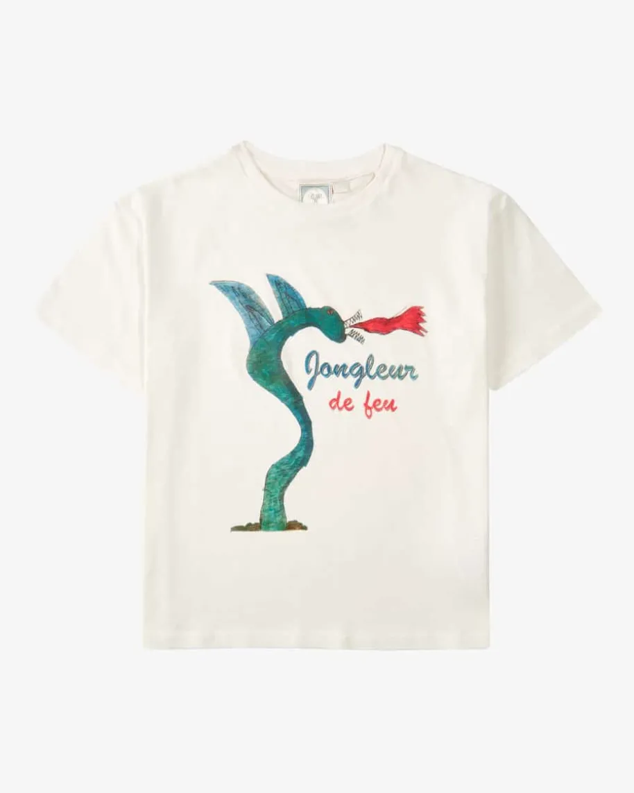 Jongleur T-Shirt für Jungen von Konges Slojd in Weiß, Petrol und Rot. Das Modellaus der Rosie Huntington-Whiteley-Kollektion besticht dank leichtem Baumwoll-Leinen-Mix mit einer angenehmen Haptik und semi-transparenter Optik, während derwitzige handgemalte Drachen-Print einen verspielten Akzent hinzufügt.