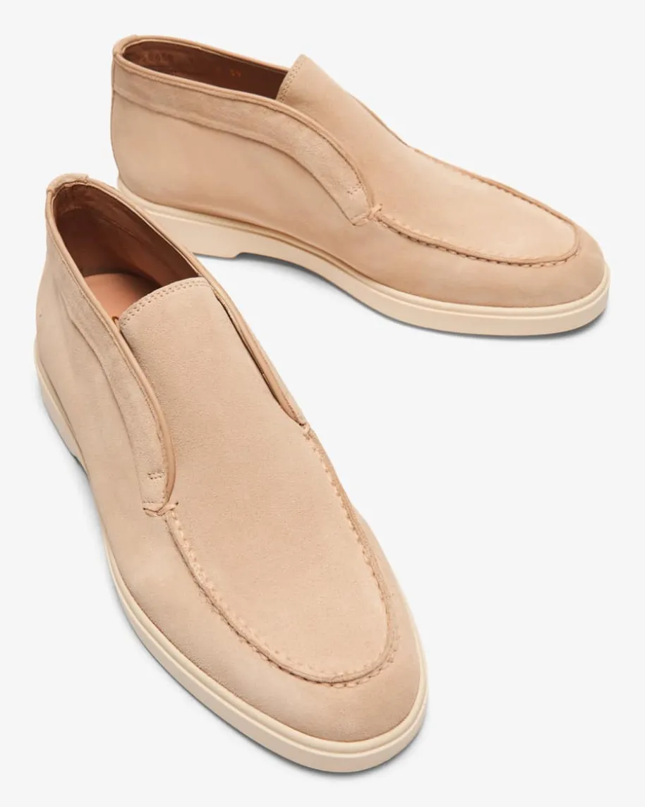 Yalta High Loafer für Damen von Santoni in Beige. Das minimalistische Modellbegeistert dank der hochwertigen, soften Veloursleder-Verarbeitung sowie derlegeren Gummisohle sowohl mit edler Optik als auch mit hohem Tragekomfort undavanciert so zu einer modern interpretierten Loafer-Version.