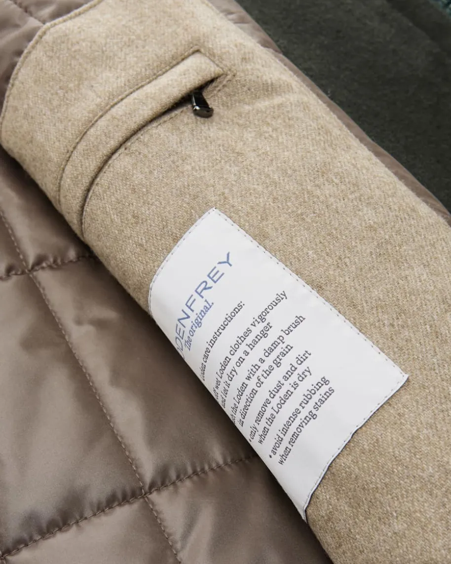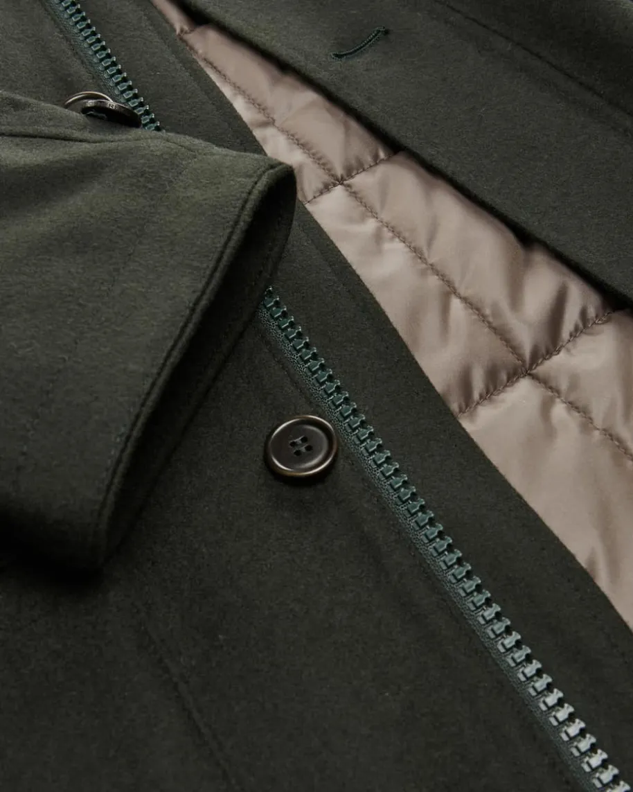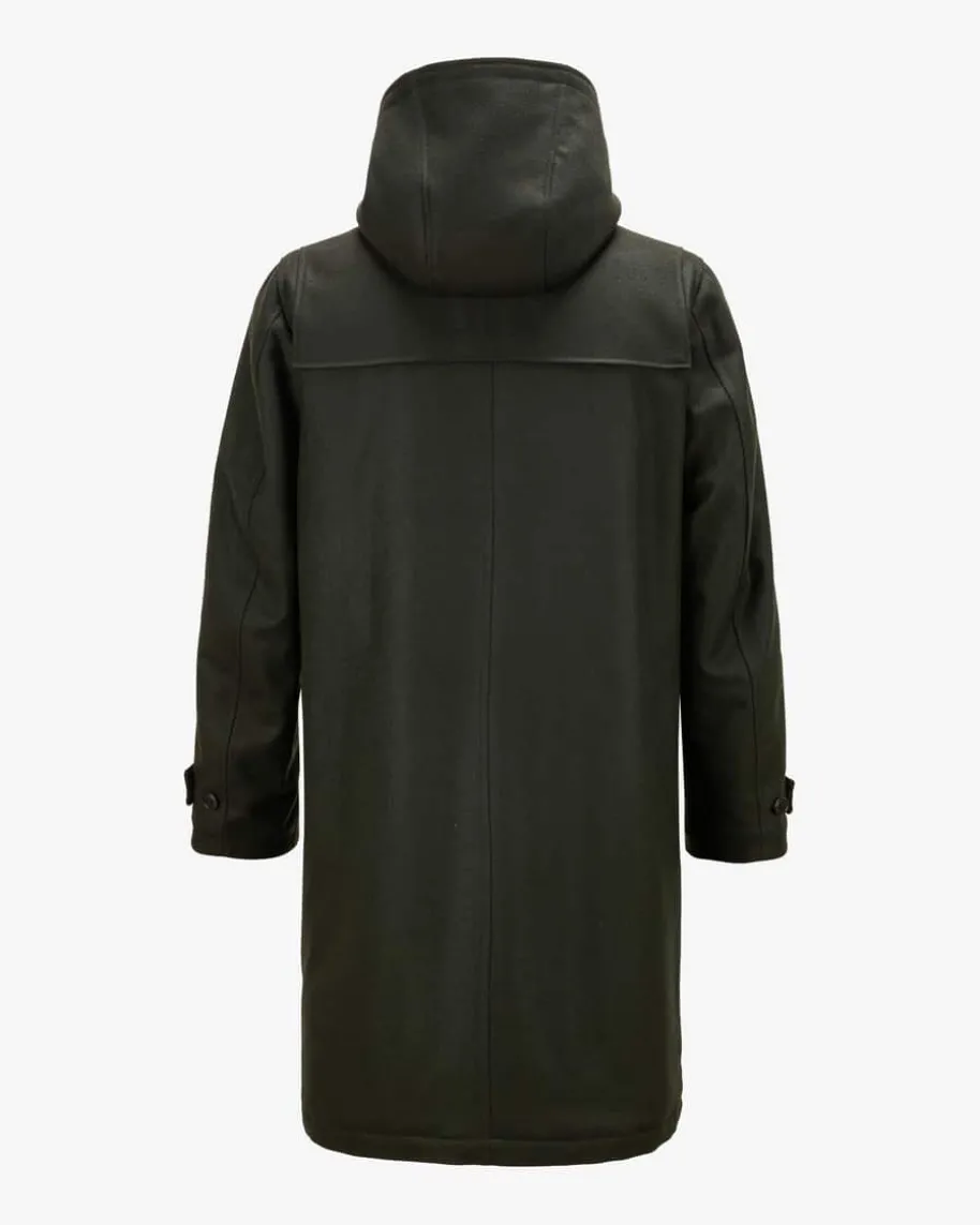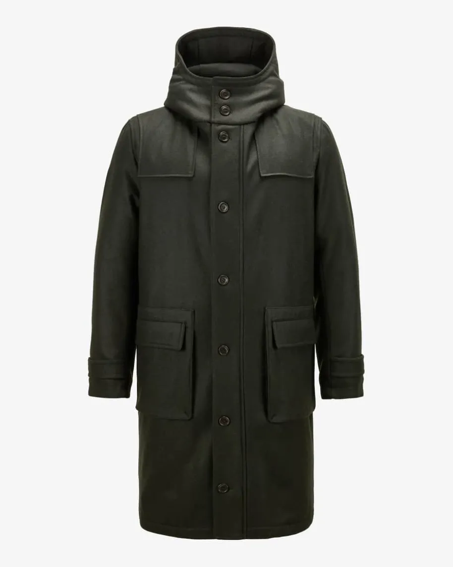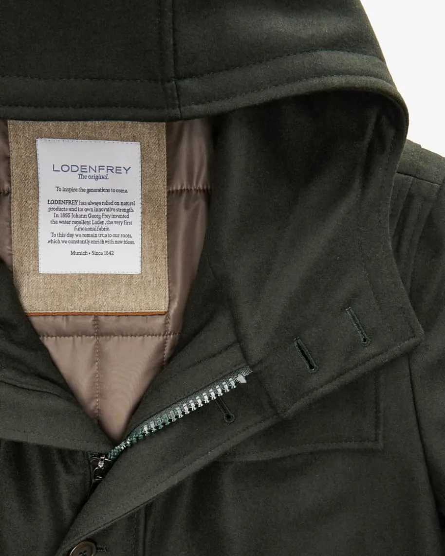 Ystad Wollmantel für Herren von LODENFREY in Dunkeloliv. Das Modell präsentiertsich dank der hochwertigen Loden-Qualität als stilvoller Begleiter, während Siedas Stepp-Innenfutter sowie der hohe Kapuzenkragen auch an kälteren Tagenoptimal warmhält.