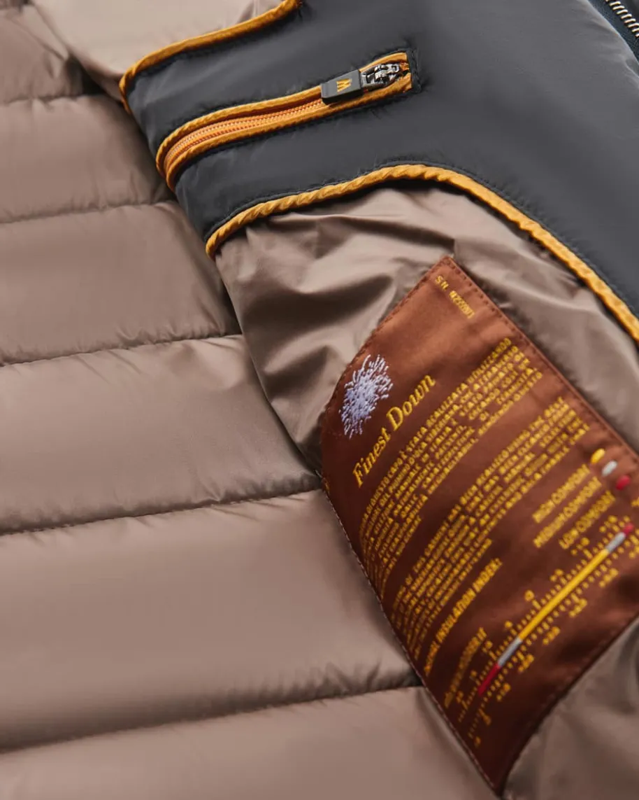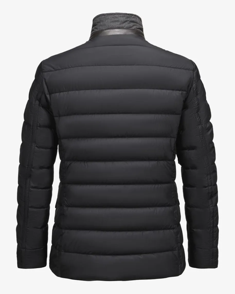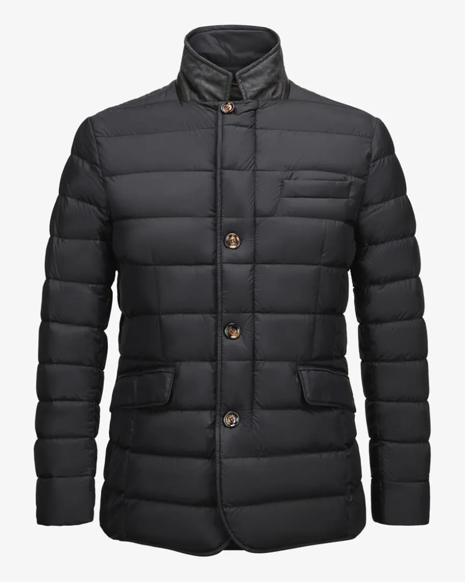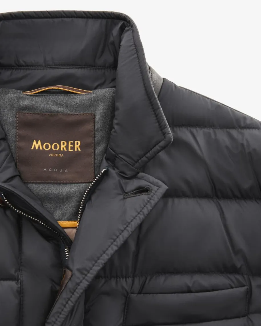 Zayn Daunenjacke für Herren von Moorer in Nachtblau. Modische Funktionalität -Dank einer hochwertigen Wattierung aus erlesenen Gänsedaunen bietet diebesonders leichte Jacke selbst bei Temperaturen bis zu -15°C perfekten Schutzvor Kälte. Das klassische Stepp-Modell begeistert dank Paspeln aus Echtleder undeinem Besatz aus weichem Schurwoll-Cashmere-Mix als zeitlos-eleganter Übergangs-Favorit.