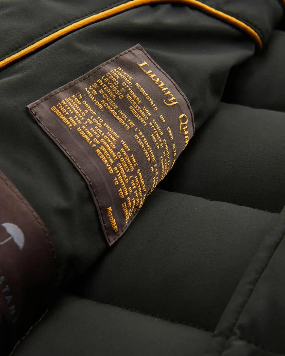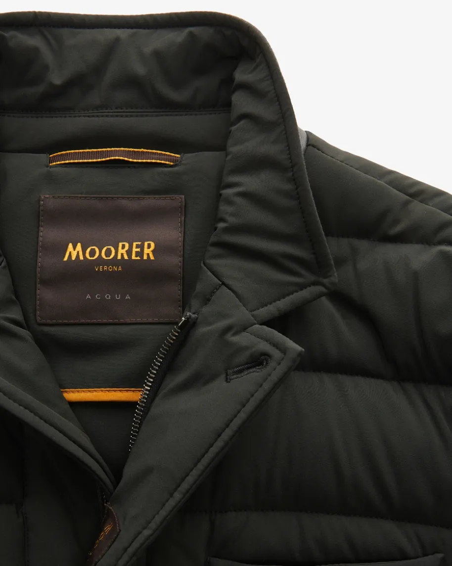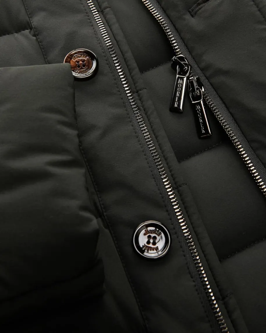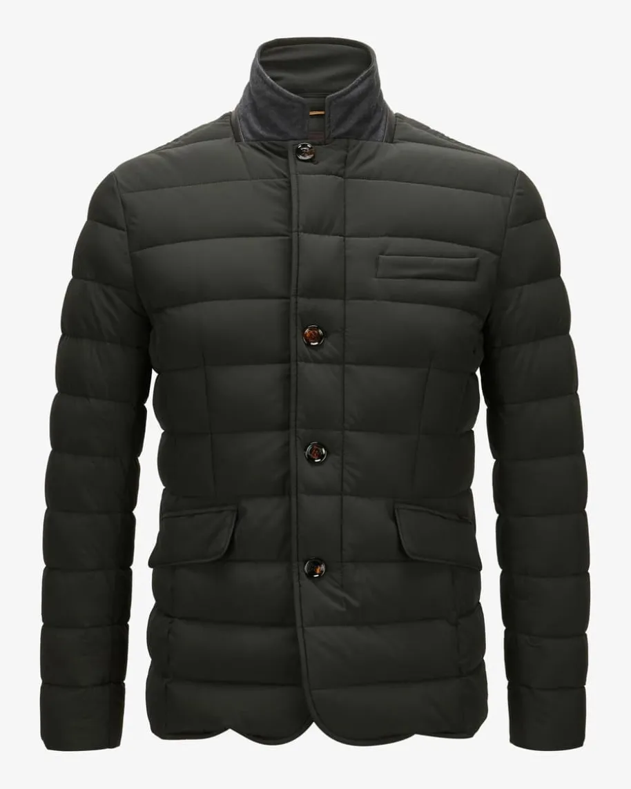 Zayn KN Daunenjacke für Herren von Moorer in Dunkeloliv. Das gesteppte Modellmit wärmender Daunenfüllung überzeugt mit klassischem Design und leichttaillierter Passform, während der raffinierte Stehkragen mit Leder-Besatz denLook stilvoll ergänzt.