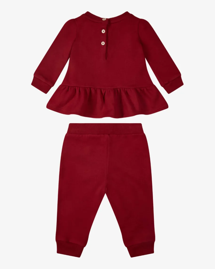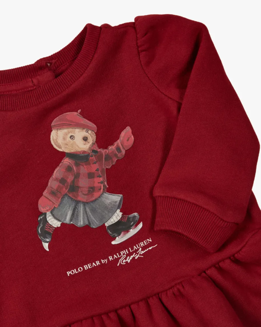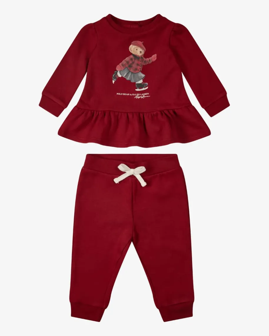 Zweiteiler für Babys von Polo Ralph Lauren in Bordeaux. Das Modell präsentiertsich mit labeltypischem Bären-Motiv mit winterlichen Schlittschuhen undfemininen Rüschen-Details. Die legere Sweat-Qualität mit besonders weicherFleece-Innenseite rundet das niedliche Set harmonisch ab.